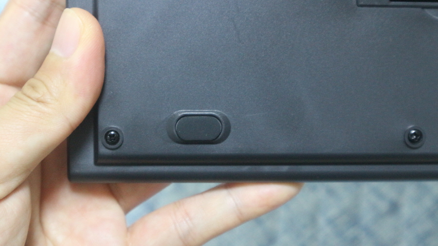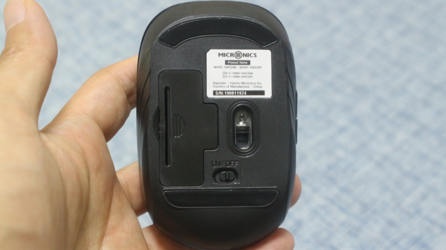 마이크로닉스 MANIC KM330 무선 슬림 키보드 마우스 합본 마우스 하단에는 전원 ON/OFF 버튼이 있어