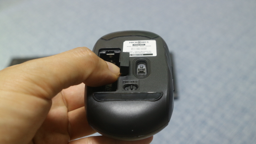 마이크로닉스 MANIC KM330 무선 슬림 키보드 마우스 합본 마우스 건전지 부분을 오픈하면 리시버 보관 홈이 있습니다.