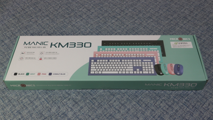 마이크로닉스 MANIC KM330 무선 슬림 키보드 마우스 합본 박스 전면 사진입니다.